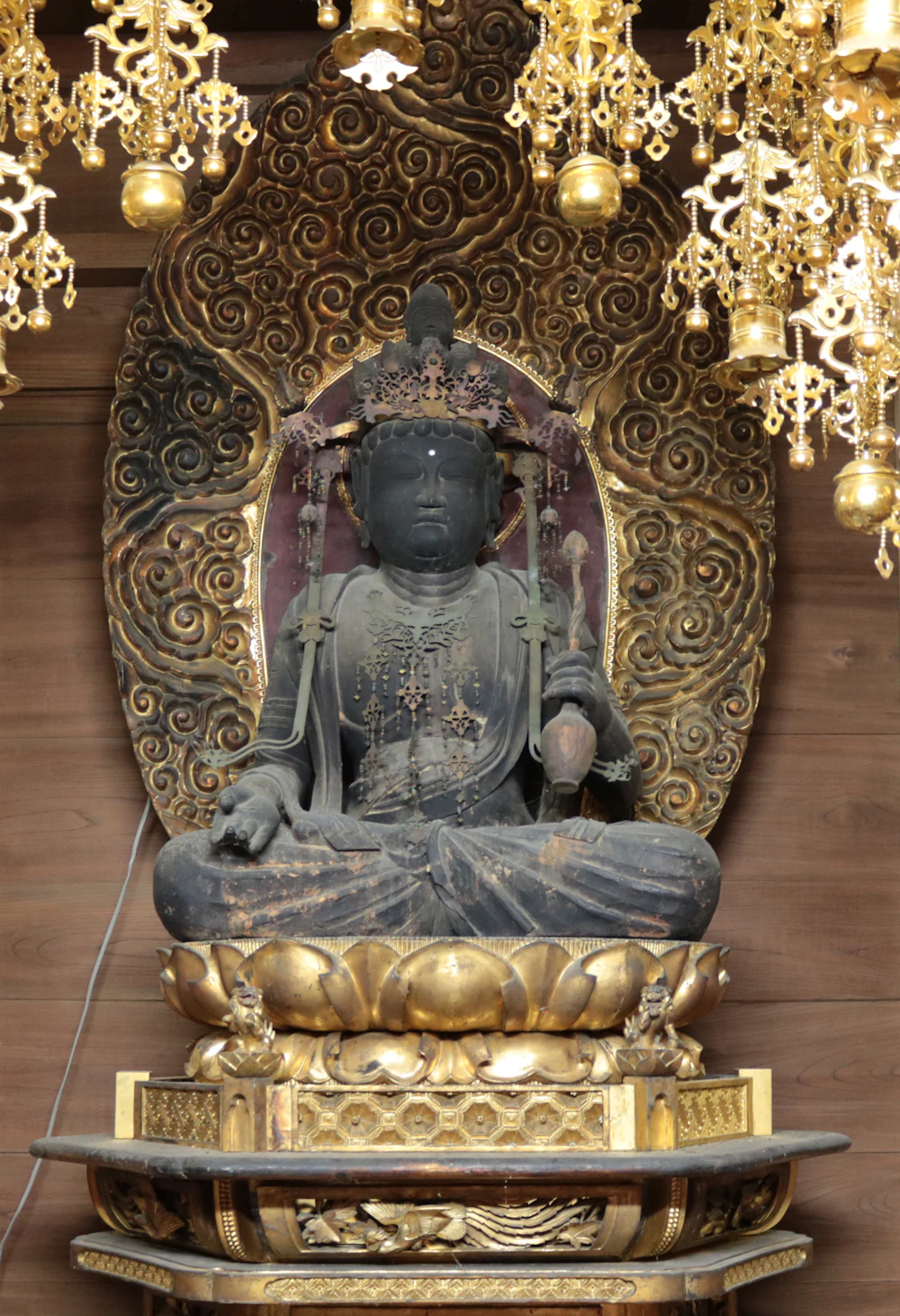 頭上に十一面を配し、右手を屈臂させ 仰掌して膝上に置き、左手は屈臂して持物を執って、条帛・天衣・裳を付けて結跏趺坐する十一面観音坐像である。頭部には天冠台を、上腕には臂釧を体幹部材より彫出している。大きく張り出した胸、絞られた腰、両膝を左右に十分広げて坐った姿からは、肉感的でどっしりとした重厚な雰囲気と安定感を表す。その分厚い膝には大まかで直線的な斜めの翻波式衣文を刻んでいる。また、長い眉や眼、豊かな頬、めくれ上がったような上唇に著しく薄い下唇、丸い顎の面相からは、堂々たる威容を感じさせる。
