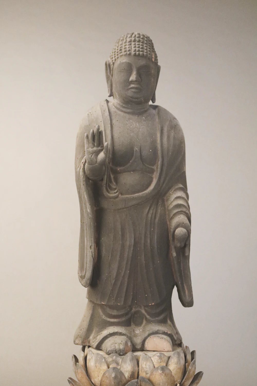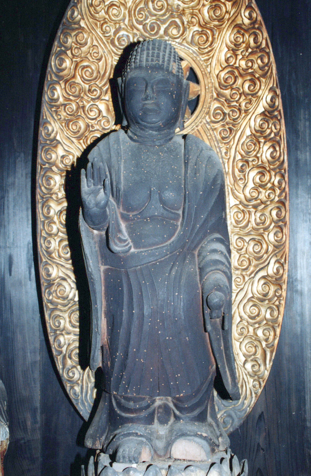 ヒノキの一木から彫出した内刳の無い一木造の薬師如来立像である。衲衣を偏袒右肩にまとい、下半身に裳をつける。切付螺髪に彫眼、三道を彫出し、左 手に持つ薬壺も共木である。球体に近い頭部に貫通しない耳朶、肉のくびれを強調した二重顎と分厚い唇は、難しい風貌を表し、太づくりの体躯に鑿を強く打ち込んで胸の線や衣文を力強く表現している。地髪との区別が不明瞭な肉髻には、刀痕も生々しい方眼状の螺髪を刻み、まさに敵対するものを力でねじ伏せる霊性秘めた尊容を具現化する表現となっている。