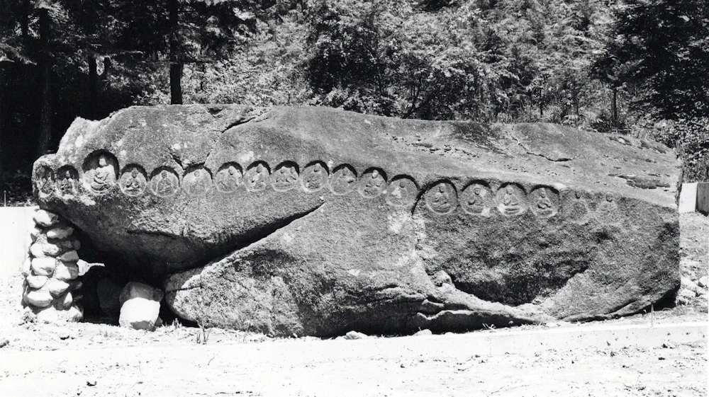 花崗岩の横長の巨石の正面に横一列に月輪を20個彫り窪め、その中にそれぞれに坐像の尊像を浮き彫りにしている。各月輪の直径は約20㎝だが、左から三番目が30.5㎝と大きく、中に定印を結ぶ阿弥陀如来を彫る。七番目は首を傾げ右手を頬にあてていることから如意輪観音と考えられる。このほか、不動明王、如来像、菩薩像、僧形像など様々な像を彫っているが、九番目だけは二体の尊像を置くことから、合わせて21尊となる。この二十一尊は、日吉山王権現二十一社信仰の本地仏に比定されている。元々は、山の中腹に在った八ツ岩権現社の秘仏として祀られていたものが、正和35年の台風に伴う土砂崩れで現在地に流れてきた。