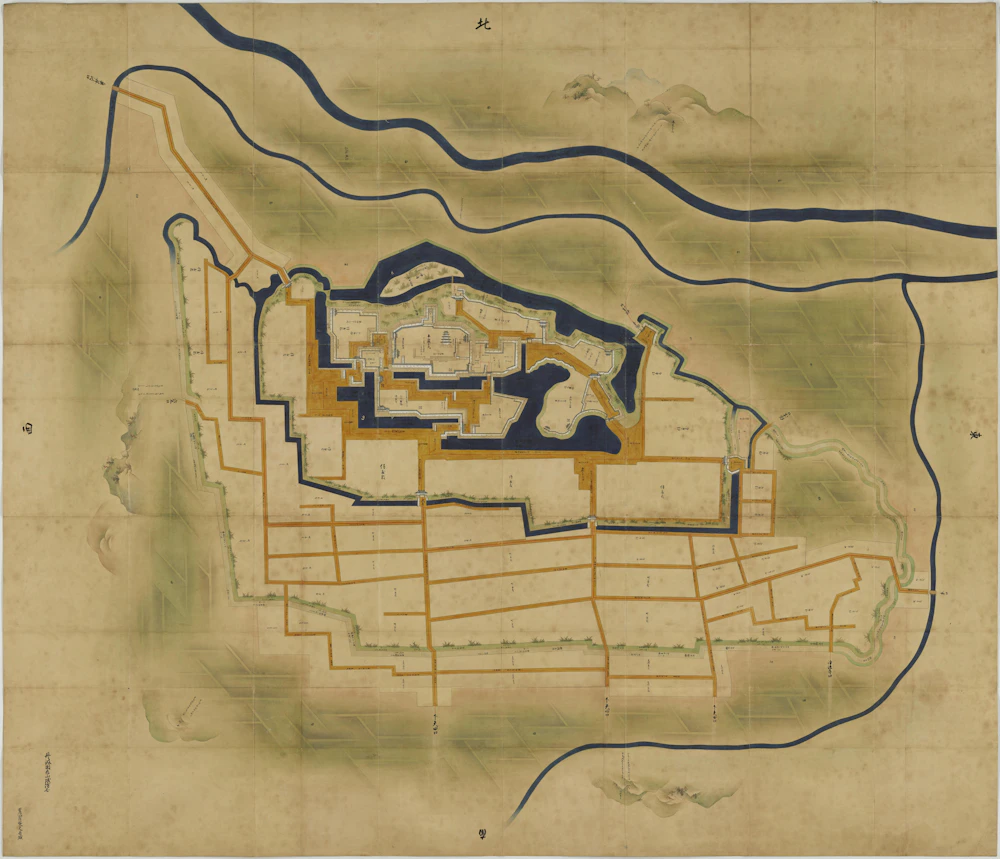 正保城絵図は、正保元年(1644年)に幕府が諸藩に命じて作成させた城下町の地図。城郭内の建造物、石垣の高さ、堀の幅や水深などの軍事情報などが精密に描かれているほか、城下の町割・山川の位置などが詳細に載されている。本絵図は、丹波亀山城下町を描いた絵図として現存最古のものである。