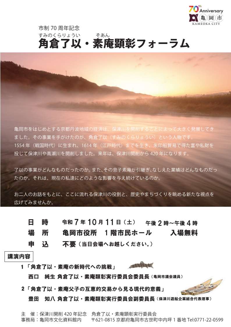 【角倉了以・素庵顕彰フォーラムのお知らせ】角倉了以(すみのくらりょうい)の事業がどんなものだったのか。またその息子素庵が引き継いだ業績は?それは、現在の私たちにどのような影響を与え続けているのか。角倉了以・素庵顕彰フォーラムでは、下記のお二人にご講演していただきます。◇「角倉了以・素庵の新時代への挑戦」西口純生 角倉了以・素庵顕彰実行委員会委員長(亀岡市議会議員)◇「角倉了以・素庵父子の互恵的交易から見る現代的意義」豊田知八 角倉了以・素庵顕彰実行委員会副委員長(保津川遊船企業組合代表理事)日付:令和7年10月11日(土)時間:午後2時~午後4時 場所:亀岡市役所 1階市民ホール 入場無料申込:不要(当日会場へお越しください)